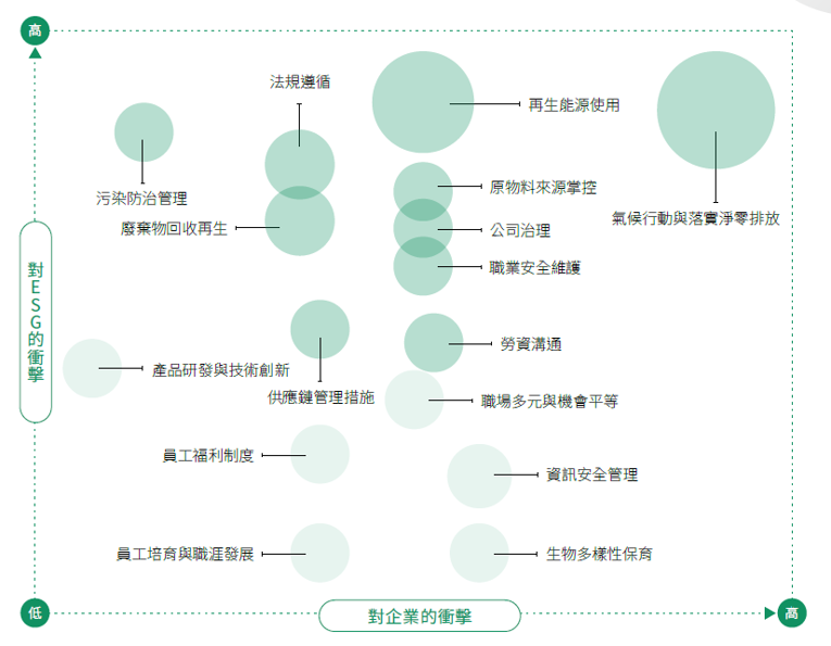 永续报告书采用GRI标准编制,重大性分析纳入欧盟双重重大性原则,其精神是要求企业在推行永续的工作时,应该再次审视执行的方式是否对于企业内部与经济 (G)、环境(E)及社会(S)造成额外的负担。鉴别议题应找出对ESG正负两面且实际或潜在的冲击,双重分析再整理出「对外部ESG冲击的程度」来对比「对企业冲击的程度」。