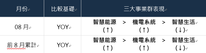 2. 空調暨智慧生活事業群:主因8月份南部雨災及氣候影響,致使營收與去年同期相比減少。